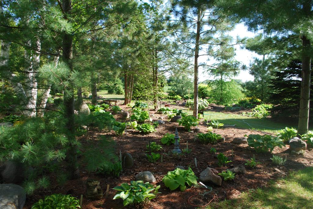 When I took my morning walk with the doggies, I decided to stroll through the area we were working on the night before. Since we removed the three trees, the hosta bed gets a little additional light which is what I think they were starved for.