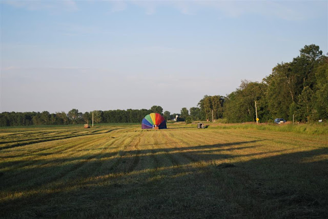 Our renter was baling hay all day Friday and Saturday (beautiful second crop alfalfa, no rain on it!) and there was the distant noise from the tractors in the field, but as I was weeding, I kept hearing a sound reminiscent of hot air balloons. I said something Carl, but he didn't hear anything other than the tractors. I went back to weeding, but then suddenly, over the woods across the road, appeared a huge hot air balloon just about brushing the tree tops. They landed in our hayfield just east of the house.