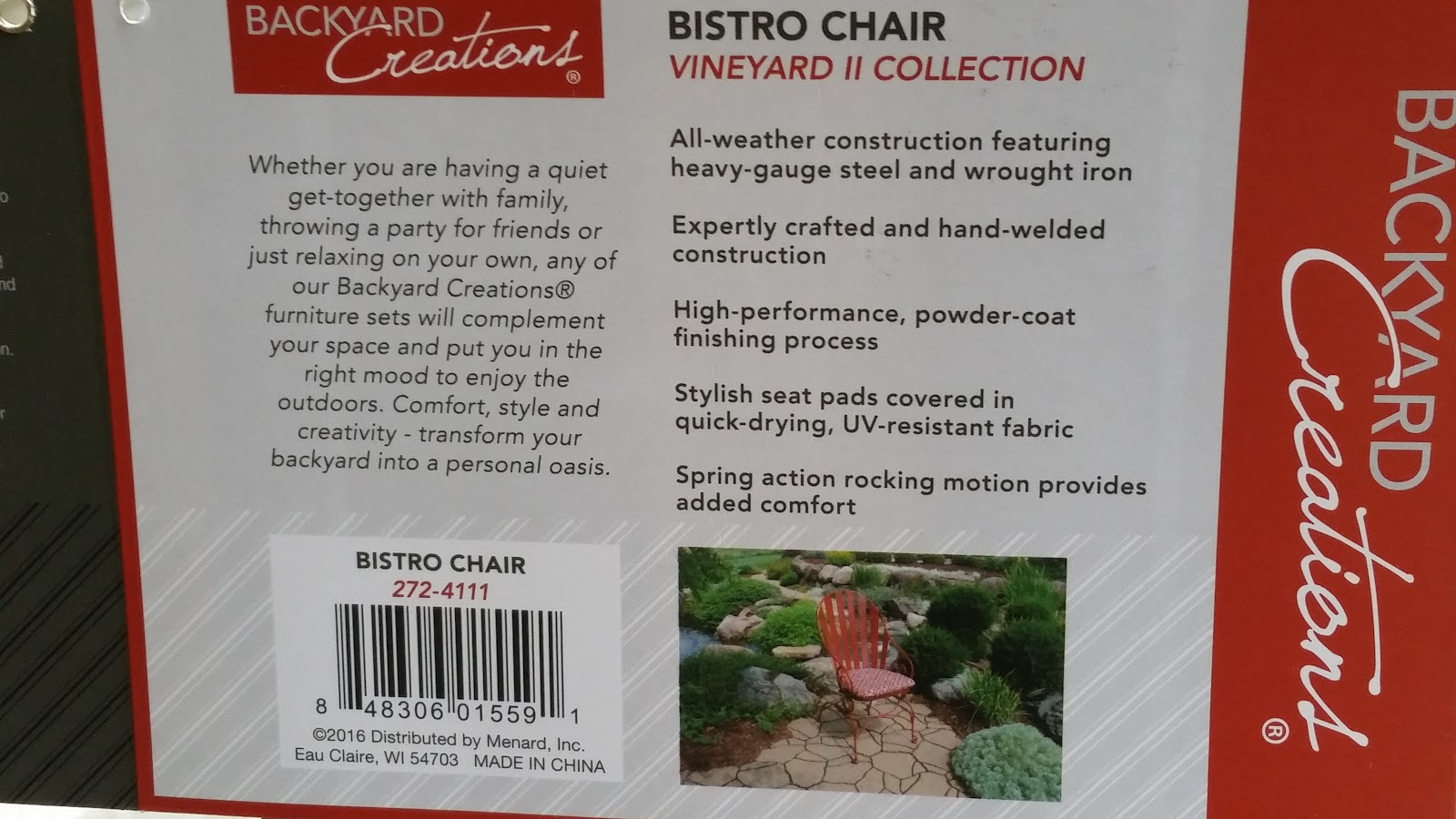 I circled the store twice, no husband with two red chairs. C'mon, he can't be that hard to locate, I wasn't gone that long, was I? Finally I found him halfway to the parking lot our car was originally parked in; he'd figured out a way to carry the chairs and was on his way to meet me.