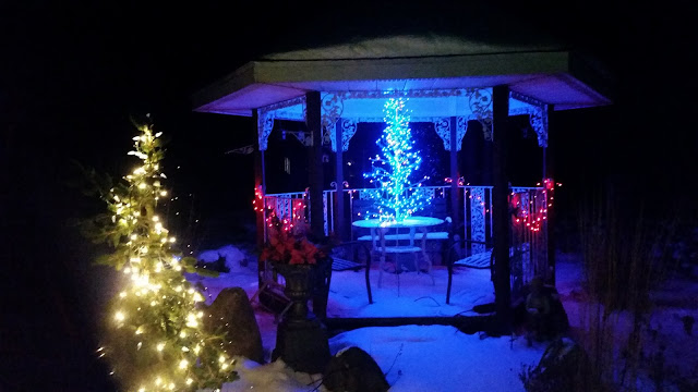 I just love your blue Christmas tree in the gazebo. It looks so beautiful! I love all your lights, and I'm sure people who pass by appreciate them too. We only managed to get one tree lit up outside, though we put out a couple lit up snowmen, which kept keeling over until we finally figured out how to stake them. It seems to have been such a crazy and busy year for everyone this year, but especially for you. I wish you and your family a safe and peaceful Christmas and New Year!