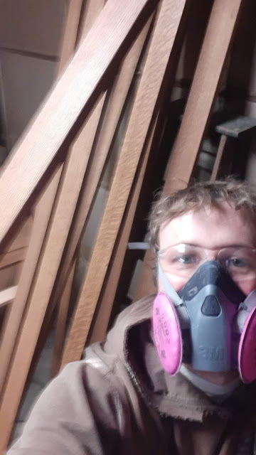 Carl and I rearranged all the wood in the shop with Joel's help and got ready to start sanding and staining. We were using a lacquer stain which stinks to the high heavens, so a respirator was in order to deal with the fumes. Don't I look elegant? I couldn't smell the lacquer, though, and that was a good thing.